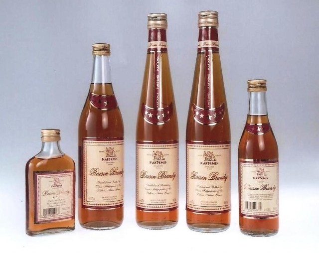 6)RAISIN BRANDY D´ARTEMIS: 100% απόσταγμα κορινθιακής μαύρης σταφίδας που περιλαμβάνει ποσότητα οινικού παλαιωμένου αποστάγματος ανάλογα με τον τύπο (3, 5 ή 7 αστέρων).