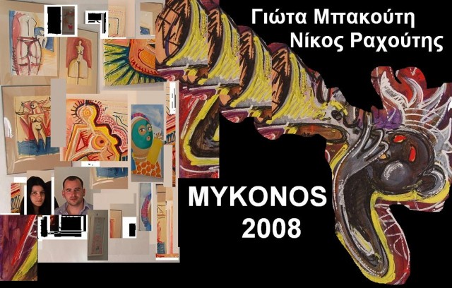 Σε μια νεανική, ευχάριστη και ενδιαφέρουσα έκθεση με τίτλο ´´ Pas de deux´´ στη Δημοτική Πινακοθήκη της Μυκόνου παρουσιάζουν μαζί τα εικαστικά τους βήματα οι Χαλκιδέοι ζωγράφοι Γιώτα Μπακούτη και Νίκος Ραχούτης, στις 21/4 έως 4/5/08.